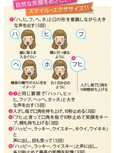 そして表情。普段から笑顔のある暮らしをしていますか? 自信のない人は、スマイル・エクササイズ=イラスト参照=を毎日朝晩、鏡の前で各2回続けてみてください。表情筋が柔らかくなり、1カ月でいい笑顔が出て、2カ月で自信がつき、3カ月で「あなたこの頃変わったわね」と言われるようになります。