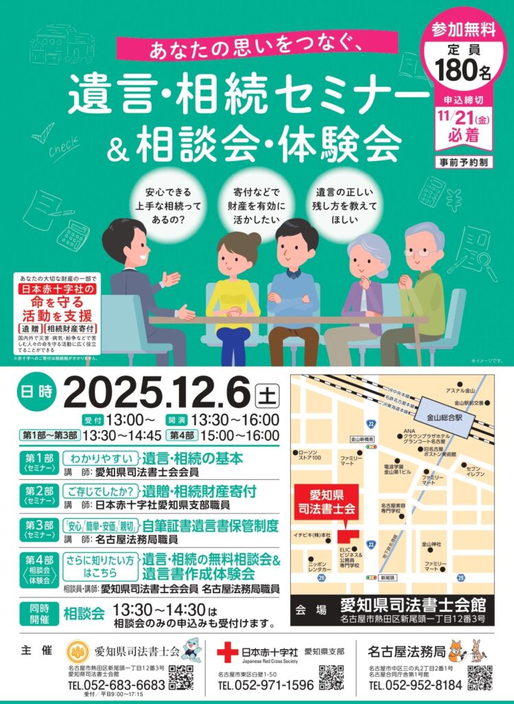 このように相続をめぐる法制度の変更に注目が集まる中、愛知県司法書士会、日本赤十字社愛知県支部、そして名古屋法務局の三者が連携し、相続・遺言・遺贈に関する無料セミナーが開催されます。