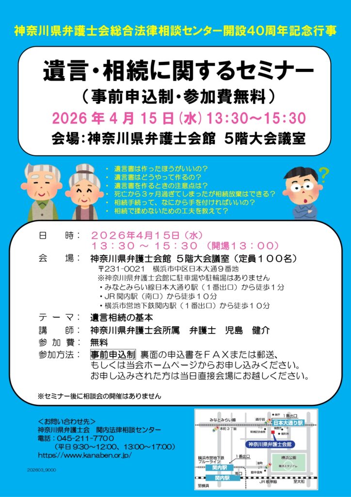 神奈川県弁護士会総合法律相談センターは、開設40周年を記念し、2026年4月15日(水)に「遺言・相続に関するセミナー」を横浜市中区で開催します。
